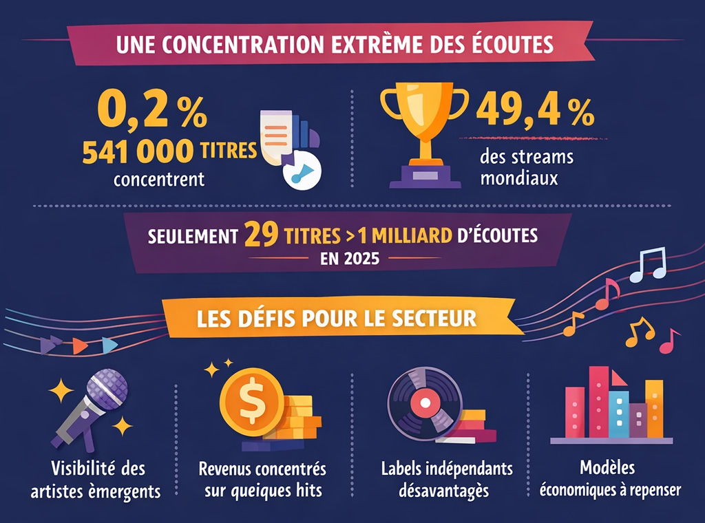 • À peine 541 000 titres — soit **0,2 % de l’ensemble des morceaux — ont généré près de 49,4 % de toute la consommation mondiale de streaming audio.