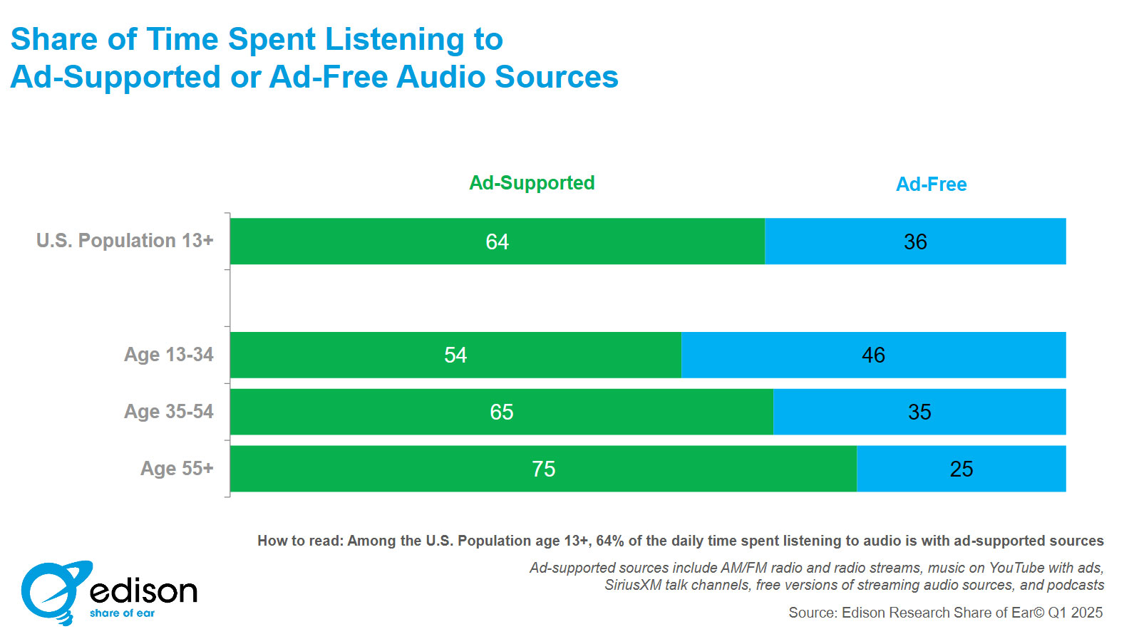Dans son étude annuelle “Top 10 Findings of 2025”, Edison Research observe un tournant historique dans les usages : le temps d’écoute de la musique en streaming sur des plateformes payantes dépasse désormais celui des offres gratuites. En 2025, 66 % de l’écoute se fait par abonnement, contre 34 % sur des modèles financés par la publicité.